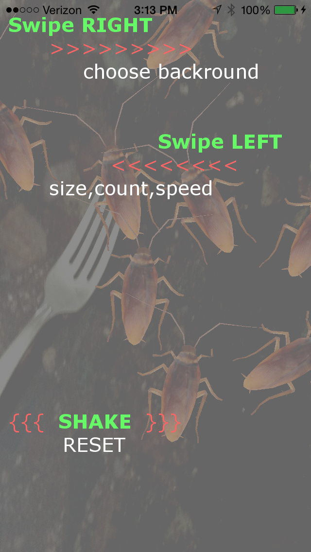 Squash roaches on your iPhone! Choose the back ground where roaches will crawl. Do not play this at dinner table - your mom will not appreciate it!